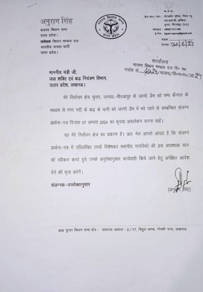 भारतीय किसान यूनियन (टिकैत गुट) द्वारा दिए गए प्रस्ताव जो चुनार क्षेत्र के किसानों की सिंचाई समस्या को लेकर जलशक्ति मंत्री को पत्र लिख कर समसपुर से गंगा का पानी लिफ्ट कराकर जरगो व अहरौरा जलाशय भरने के लिए अनुरोध किया था। इसके बाद जिलाधिकारी के माध्यम से शासन में प्रस्ताव भिजवाया। जिस पर शासन ने सैद्धांतिक सहमति दे दी है। भविष्य में इसके लिए मुख्यमंत्री जी से व्यक्तिगत अनुरोध कर के शीघ्र योजना को मूर्त रूप दिलाकर धरातल पर उतारने का प्रयास होगा।