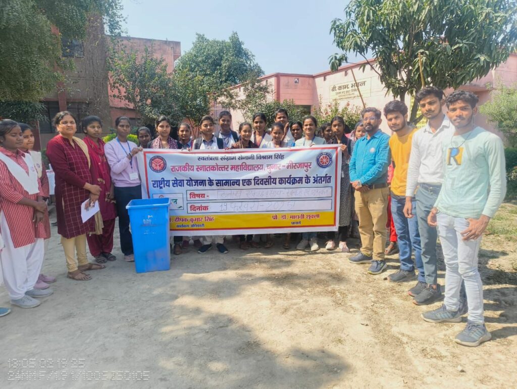 स्वतंत्रता संग्राम सेनानी विश्राम सिंह राजकीय स्नातकोत्तर महाविद्यालय चुनार मिर्जापुर में आज दिनांक 19/02/2025 को प्राचार्य प्रोफेसर माधवी शुक्ला के मार्गदर्शन में राष्ट्रीय सेवा योजना के द्वितीय सामान्य एक दिवसीय शिविर एवं संगोष्ठी का आयोजन महाविद्यालय परिसर में स्वच्छता जागरूकता कार्यक्रम के अंतर्गत पर्यावरण संरक्षण एवं प्लास्टिक प्रदूषण पर श्रमदान करके किया। कार्यक्रम राष्ट्रीय सेवा योजना के प्रेरक गीत उठे समाज के लिए उठे से प्रारंभ किया गया । कार्यक्रम में राष्ट्रीय सेवा योजना के कार्यक्रम अधिकारी डॉ दीपक कुमार सिंह नें स्वयंसेवक/स्वयंसेविकाओं को राष्ट्रीय सेवा योजना के मुख्य लक्ष्य, कार्ययोजना एवं प्रेरणा गीत की उपयोगिता पर कार्य करने के लिए स्वयंसेवक को प्रेरित किया। उक्त कार्यक्रम में कार्यक्रम सहप्रभारी डॉ विद्या सिंह के नेतृत्व में स्वयंसेविकाओं नें वनस्पतिक उद्यान के पौधों को साफ, सिंचित एवं संरक्षित करने का कार्य किया। जबकि स्वयंसेवकों नें परिसर को स्वच्छ रखने के लिए प्लास्टिक एवं कूड़ा-कचरा को उपयुक्त डस्टबिन में प्रयोग करने के समस्त छात्र-छात्राओं को प्रेरित कर श्रमदान किया। स्वयंसेवकों नें सीखा कि कैसे पर्यावरण को सतत विकास के लिए प्रदूषण मुक्त रखना है। वनस्पतिक उद्यान पर्यावरण संरक्षण का ही एक रूप है।