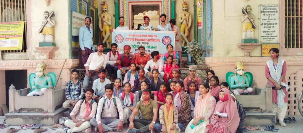 स्वतंत्रता संग्राम सेनानी विश्राम सिंह राजकीय स्नाकोत्तर महाविद्यालय चुनार, मिर्जापुर की राष्ट्रीय सेवा योजना इकाई के सत्र- 2024-25 के चतुर्थ सामान्य एक दिवसीय शिविर का आयोजन फुलवरिया गांव एवं आचार्य बिट्ठलनाथ मंदिर में हुआ l इस दौरान स्वयंसेवकों ने श्रमदान व साफ–सफाई का कार्य बृहद स्तर पर चलाया l जिसके अंतर्गत पूरे मंदिर परिसर की सफाई का कार्य किया गया l बौद्धिक कार्यक्रम में कार्यक्रम अधिकारी डॉ. दीपक कुमार ने भारतीय संस्कृति में बल्लभाचार्य के वैष्णव दर्शन के माध्यम से सेवाभाव, शुद्धता व स्वच्छता के प्रति स्वयंसेवकों को जागृत किया l परिसर में लगे पौधों को पानी देने का कार्य भी हुआ l कार्यक्रम सह प्रभारी डॉ. विद्या सिंह ने अपने सांस्कृतिक धरोहरों को संरक्षित करने पर बल दिया l तत्पश्चात स्वयंसेवकों भगवान विट्ठलदास का दर्शन किया एवं साथ में होली भी मनाया । कार्यक्रम में बढ़ चढ़कर स्वयंसेवी छात्र-छात्राओं ने प्रतिभाग किया ।