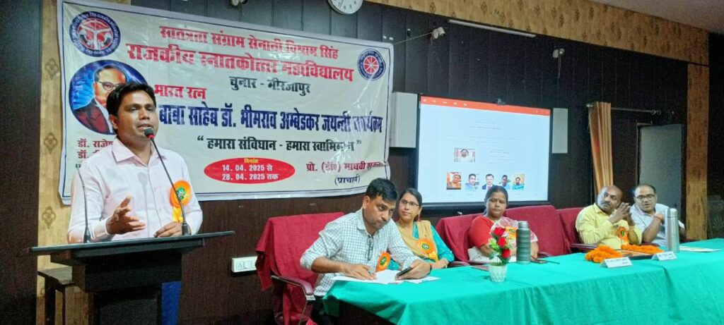 समावेशी विकास राष्ट्रवाद का मूल तत्व – डॉ रेशम लाल स्वतंत्रता संग्राम सेनानी विश्राम सिंह राजकीय स्नातकोत्तर महाविद्यालय चुनार, मीरजापुर में आज दिनांक 28 अप्रैल 2025 को भारत रत्न बाबा साहब डॉ० भीमराव अम्बेडकर जी की जयंती पखवाड़ा कार्यक्रम के समापन के अवसर पर ‘डॉ० भीमराव अम्बेडकर की राष्ट्रवाद की अवधारणा : स्वतंत्रता, समानता एवं सामाजिक न्याय के विशेष सन्दर्भ में’ विषयक संगोष्ठी का आयोजन किया गया। कार्यक्रम का शुभारम्भ मुख्य अतिथि डॉ रेशम लाल, महात्मा गाँधी काशी विद्यापीठ, वाराणसी एवं महाविद्यालय की प्राचार्य प्रोफेसर (डॉ०) माधवी शुक्ला ने माँ सरस्वती की प्रतिमा एवं भारत रत्न बाबा साहब डॉ भीम राव अम्बेडकर के चित्र पर माल्यार्पण एवं दीप प्रज्ज्वलन कर किया। मुख्य अतिथि डॉ० रेशम लाल ने कहा कि भारतीय का संविधान देश में समावेशी विकास की अवधारणा को व्यक्त करता है जो राष्ट्रवाद का मूल आधार है। अपने अध्यक्षीय सम्बोधन में प्राचार्य प्रोफेसर माधवी शुक्ला ने कहा कि हम सभी को बाबा साहब के बताए रास्ते पर चलकर राष्ट्रवाद को सुदृढ़ करना चाहिए। कार्यक्रम का संचालन संयोजक डॉ राजेश कुमार एवं धन्यवाद ज्ञापन डॉ दीप नारायण ने किया । दिनाँक 14 अप्रैल 2025 से प्रारम्भ हुए बाबा साहब के जयन्ती पखवाडा के अन्तर्गत जन- जागरूकता रैली, विविध प्रतियोगिताएं एवं संगोष्ठी का आयोजन किया गया। इस अवसर पर डॉ चन्दन साहू, डॉ कुसुम लता, डॉ सूबेदार यादव, डॉ राजेश कुमार दूबे, डॉ देव कुमार, डॉ रजनीश, डॉ भास्कर द्विवेदी, डॉ संकठा सोनकर, डॉ मनोज प्रजापति, डॉ अरविन्द कुमार , डॉ अरुणेश कुमार, डॉ दीपक कुमार सिंह, डॉ अवधेश सिंह यादव, डॉ नलिनी सिंह, डॉ रीता मिश्रा, डॉ शिखा तिवारी, डॉ चन्दन द्विवेदी, डॉ शैलेन्द्र कुमार, डॉ शिव कुमार, श्री धर्मेन्द्र सिंह एवं समस्त प्राध्यापक कर्मचारी गण तथा भारी संख्या में छात्र- छात्राएं उपस्थित रहे।