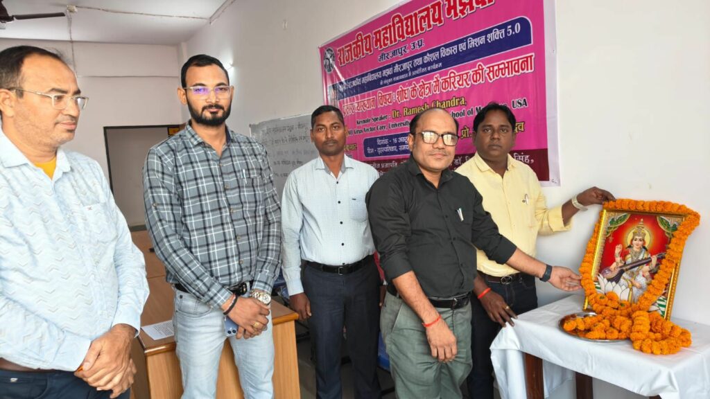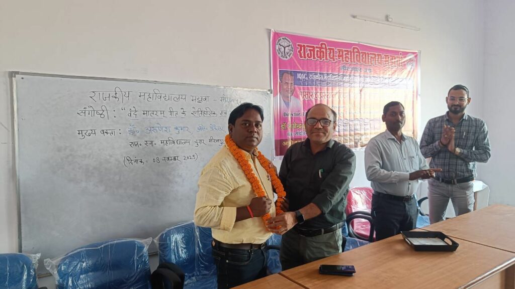 आज दिनांक 08 नवम्बर 2025 को भारत सरकार के सांस्कृतिक मंत्रालय के निर्देशानुसार राजकीय महाविद्यालय मझवां मिर्जापुर में प्राचार्य प्रो. सूबेदार यादव के अध्यक्षता में वन्दे मातरम् गीत के 150 वर्ष पूर्ण होने पर “वन्दे मातरम् गीत के ऐतिहासिक एवं राष्ट्रिय महत्त्व” विषयक संगोष्ठी का आयोजन किया गया । संगोष्ठी में मुख्य वक्ता के रूप में आमंत्रित राजकीय स्नातकोत्तर महाविद्यालय चुनार मीरजापुर के इतिहास विभाग के वरिष्ठ असिस्टेंट प्रोफेसर डॉ. अरुणेश कुमार ने वन्दे मातरम् गीत की महत्ता पर विस्तार से प्रकाश डाला | उन्होंने बताया कि बंकिम चन्द्र चट्टोपाध्याय द्वारा रचित वन्दे मातरम् गीत गुलामी के दौर में ब्रिटिश शासन के खिलाफ भारतीयों में मां, मिट्टी और मनुष्य के प्रति जनचेतना को जगाने महत्वपूर्ण भूमिका निभाई | संगोष्ठी के अध्यक्षता कर रहे महाविद्यालय के प्राचार्य प्रो. सूबेदार यादव ने बताया कि हमें अपने गौरवशाली इतिहास को कभी भूलना नहीं चाहिए । उक्त कार्यक्रम संचालन डॉ. राजेन्द्र कुमार ने किया तथा धन्यवाद डॉ. मनोज कुमार प्रजापति ने किया । इस संगोष्ठी में महाविद्यालय के प्राध्यापक डॉ. विजय बहादुर, डॉ.अनुपम वर्मा, डॉ.शैलेन्द्र कुमार के साथ-साथ महाविद्यालय के समस्त छात्र-छात्राएं उपस्थित रहे ।