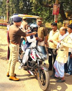 पुलिस महानिदेशक उ0प्र0 महोदय के निर्देशन में चलाए जा रहे “यातायात माह नवम्बर जागरुकता अभियान” के तहत आज दिनांक 08.11.2025 को “सोमेन बर्मा” वरिष्ठ पुलिस अधीक्षक मीरजापुर के निर्देशन में ‘मनीष कुमार मिश्रा’ अपर पुलिस अधीक्षक आपरेशन द्वारा थानाध्यक्ष “दयाशंकर ओझा” थाना राजगढ़ के साथ यातायात सम्बन्धी नियमों के पालन कराने के प्रति थाना राजगढ़ क्षेत्रांतर्गत ददरा ब्लाक तिराहा पर आमजन और मोटर साइकिल सवार व्यक्तियों को यातायात नियमों को पालन करने हेतु जागरूक किया गया तथा वाहन चलाते समेय हेलमेट पहनने व चार पहिया वाहन चलाते समय सीट बेल्ट लगाने की हिदायत भी दी गयी, यह भी बताया गया की यातायात नियमों का पालन करके ही वाहन दुर्घटनाओ में कमी लायी जा सकती है । इस दौरान बिना हेलमेट पहने मोटर साइकिल सवार जरूरतमन्द 10 व्यक्तियों को निःशुल्क हेलमेट वितरण भी किया गया ।