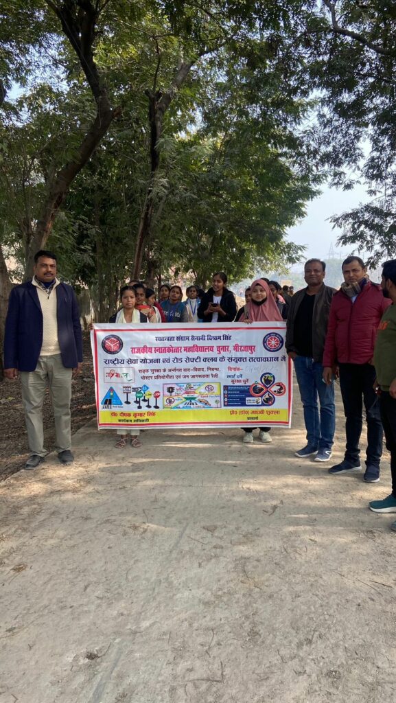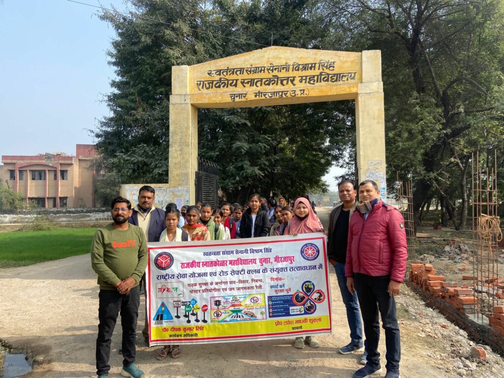 स्वतंत्रता संग्राम सेनानी विश्राम सिंह राजकीय स्नातकोत्तर महाविद्यालय चुनार मिर्जापुर में आज दिनांक – 6 जनवरी 2026 को राष्ट्रीय सेवा योजना एवं रोड सेफ्टी क्लब के संयुक्त तत्वावधान में सड़क सुरक्षा अभियान तथा जीरो फेटेलिटी समाधान के कार्यक्रमों की श्रृंखला में मलिन बस्ती खैरूद्दीनपुर में जागरूकता रैली निकाली गई , जिसमें सड़क सुरक्षा के नारों “सड़क सुरक्षा,जीवन रक्षा” , नो हेलमेट, नो पेट्रोल आदि नारों के साथ जनसामान्य को जागरूक किया। प्राचार्य प्रोफेसर डॉ माधवी शुक्ला ने कहा कि वर्तमान में सड़क दुर्घटनाओं में निरंतर वृद्धि हो रही है, समाज के सभी नागरिकों को जागरूक करके इसे रोका जा सकता है। इसके लिए व्यापक जनजागरुकता की आवश्यकता है। कार्यक्रम का नेतृत्व राष्ट्रीय सेवा योजना के कार्यक्रम अधिकारी डॉ. दीपक कुमार सिंह, डॉ. अवधेश सिंह यादव, डॉ. अरविन्द कुमार, डॉ. दीप नारायण एवं रोड सेफ्टी क्लब के सदस्यों ने किया।