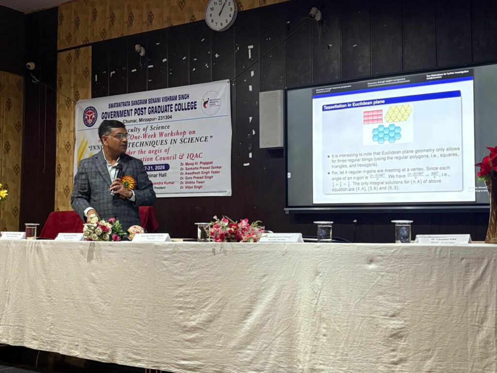 कार्यक्रम का शुभारंभ महाविद्यालय की प्राचार्य प्रो० (डॉ०) माधवी शुक्ला, मुख्य अतिथि प्रो० वेंकटेश्वर तिवारी एवं आई०क्यू०ए०सी० कॉर्डिनेटर डॉ० चंदन साहू के द्वारा मां सरस्वती की प्रतिमा पर माल्यार्पण एवं दीप प्रज्ज्वलन के साथ किया गया। प्राचार्य प्रो० (डॉ०) माधवी शुक्ला ने कहा कि गणित विषय विद्यार्थियों में तार्किक चिंतन, विश्लेषणात्मक क्षमता एवं वैज्ञानिक दृष्टिकोण के विकास में महत्वपूर्ण भूमिका निभाता है। कार्यशाला के द्वितीय दिवस का आयोजन गणित विभाग द्वारा किया गया। इस अवसर पर आयोजित विशेष व्याख्यान का विषय “ज्योमेट्री थ्रू द एजिस: ए मॉडर्न पर्सपेक्टिव” रहा।