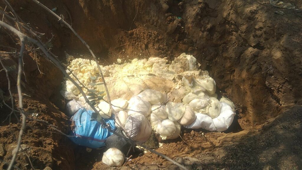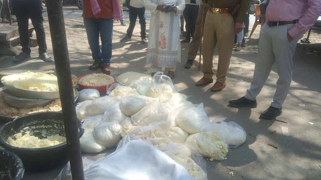 चुनार क्षेत्र स्थित खोवा मंडी में उसे समय हड़कंप मच गया जब खाद्य विभाग की टीम ने अचानक छापेमारी की कार्यवाही के दौरान भारी मात्रा में मिलावटी खोवा बरामद किया गया जांच के दौरान टीम मैं पाया की खावा मानकों के अनुरूप नहीं था और उसमें मिलावट की भारी आशंका पाई गई लगभग 10 कुंतल से भी अधिक मिलावटी खोवा मौके से बरामद किया गया और गड्ढा खोदकर उसे तुरंत नष्ट किया गया प्रशासन अधिकारियों ने संबंधित व्यापारियों को कड़ी चेतावनी देते हुए आगे भी सख्त कार्रवाई की जाएगी ऐसी हिदायत दी गई मिलावट खोरो पर शक्ति जारी रहेगी त्योहारों के मध्यनजर खाद्य विभाग लगातार अभियान चला चलाये गया अधिकारियों ने स्पष्ट किया कि आम जनता के स्वास्थ्य से खिलवाड़ करने वालों को बक्सा नहीं जाएगा प्रशासन ने आम नागरिकों से अपील की की संगीत मादक पदार्थों की सूचना तुरंत मादक पदार्थ की बिक्री की जा रही है मिलावटी सामानों की भी बिक्री की जा रही है तो इसकी सूचना तुरंत प्रशासन को दें