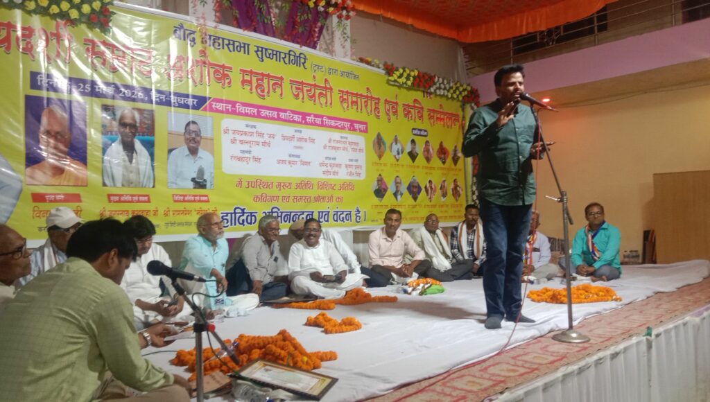 बौद्ध महासभा सुष्मारगिरि चुनार मिर्जापुर द्वारा सम्राट अशोक जन्मोत्सव विमल उत्सव वाटिका में धूमधाम से मनाया गया।कार्यक्रम दो चरणो मेें हुआ। पहले चरण का शुभारंभ पूज्य भरते विनय दत्त तथा संघदीप द्वारा संयुक्त रूप से पूजा वंदना से हुआ। कार्यक्रम के मुख्य अतिथि तथा सामाजिक चिंतक जगन्नाथ कुशावाहा तथा विशिष्ठ अतिथि ई0 रामनरेश नरेश रहे।कार्यक्रम में पूज्य भत्ते विनय दत्त तथा संघदीप को चीवर तथा बुद्ध की प्रतिमा देकर सम्मानित किया गया इसी प्रकार अतिथियों को भी शाल तथा बुद्ध की प्रतिमा देकर सम्मानित किया।कार्यक्रम अध्यक्षता कर रहे प्रोफेसर चंद्रशेखर सिंह को सम्मानित किया गया,साथ मेें तीन बौद्ध उपासक नयन वर्मा ,रामदुलारे बौद्ध तथा विजय कुमार मौर्य को सम्राट अशोक का चित्र देकर सम्मानित किया गया ,महासभा के दो पदाधिकारी राजनरायन सिंह तथा अजय कुमार मौर्य को सम्मानित किया।महिला वक्ता शालिनी कुशावाहा को ज्योतिराव फूले व सावित्रीबाई का चित्र देकर सम्मानित किया ।कार्यक्रम मेें आए पत्रकार श्री रणवीर सिंह, शंकर शर्मा ,अनिल मिश्र आदि को अंगवस्त्र तथा सम्राट अशोक का चित्र देकर सम्मानित किया गया ।सम्राट अशोक के जीवन पर प्रियदर्शी अशोक सिंह, शालिनी कुशावाहा, ई रामनरेश व मुख्य अतिथि ने प्रकाश डाला।कार्यक्रम का संचालन रंगबहादुर सिंह ने किया।द्वितीय चरण मेें कविसम्मेलन हुआ जिनमें सुष्मारगिरी साहित्यिक मंच चुनार द्वारा वरिष्ठ साहित्यकार हरिवंश सिंह बवाल को शाल व माता सावित्रीबाई साहित्य सम्मान व नाथ सोनांचली को कुशवाह कांत साहित्य सम्मान से सम्मानित किया गया।आये सभी कवियों को अंगवस्त्र से सम्मानित किया गया।कार्यक्रम मेें प्रियदर्शी अशोक सिंह, गोपाल कुशावाहा, राधेश्याम पाल, यथार्थ विष्णु, प्रदुम्न त्रिपाठी, मोहन लाल यादव, छोटेलाल सिंह मनमीत, नाथ सोनांचली, राजकुमार राजन, अनवर अली अनवर, प्रमोद कुमार मौर्य, शीतला गौरव, जयप्रकाश जय, संजय यादव उमंग, माखनलाल झटपट, रामनरेश नरेश, राजनरायन सिंह, अजय कुमार मौर्य ने कविता सुनाई, अध्यक्षता जय प्रकाश जय संचालन नाथ सोनांचली ने किया। इस अवसर पर करतार सिंह,सौरभ पुजारी,धीरेन्द्र सिंह,प्रशांत कुशवाहा सहित बड़ी संख्या में