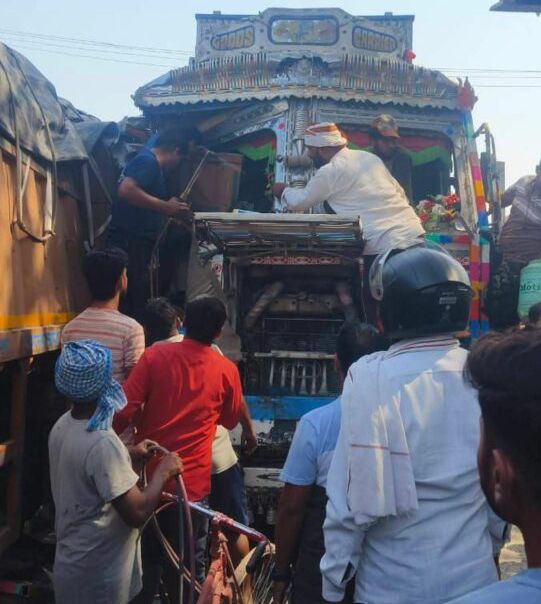 नरायनपुर मोटर मंडी में दो ट्रकों की आमने-सामने जोरदार भिड़ंत, एक ड्राइवर केबिन में फंसा गैस कटर से रेस्क्यू ऑपरेशन जारी मौके पर स्थानीय पुलिस मौजूद
